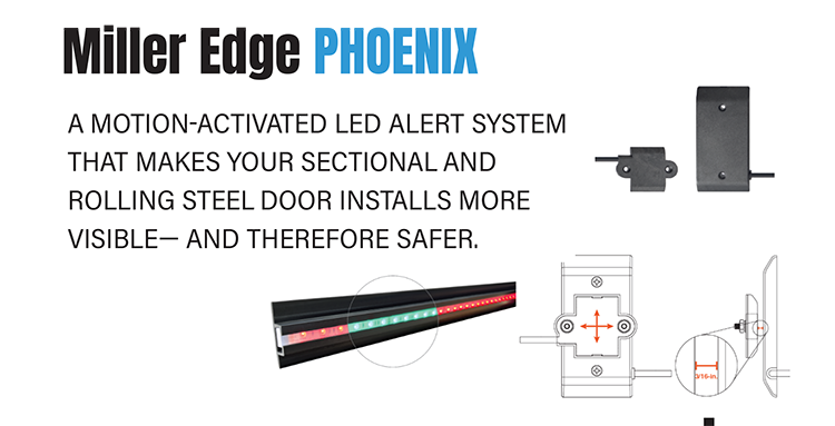 We are excited to introduce the Phoenix motion-activated LED alert systems. The new Miller Edge product makes your sectional and rolling steel door installations more visible and there, safer. Phoenix operates independently of the door operator, making installs straightforward and keeping maintenance low. The integrated accelerometer activates high-visibility LEDs the moment the door starts moving—giving anyone nearby a clear visual warning to stay clear of the opening. The inductive charging pads transfer power from a standard 120V outlet to a rechargeable battery powering the LED strip—eliminating coil cords and tapping into operator controls.